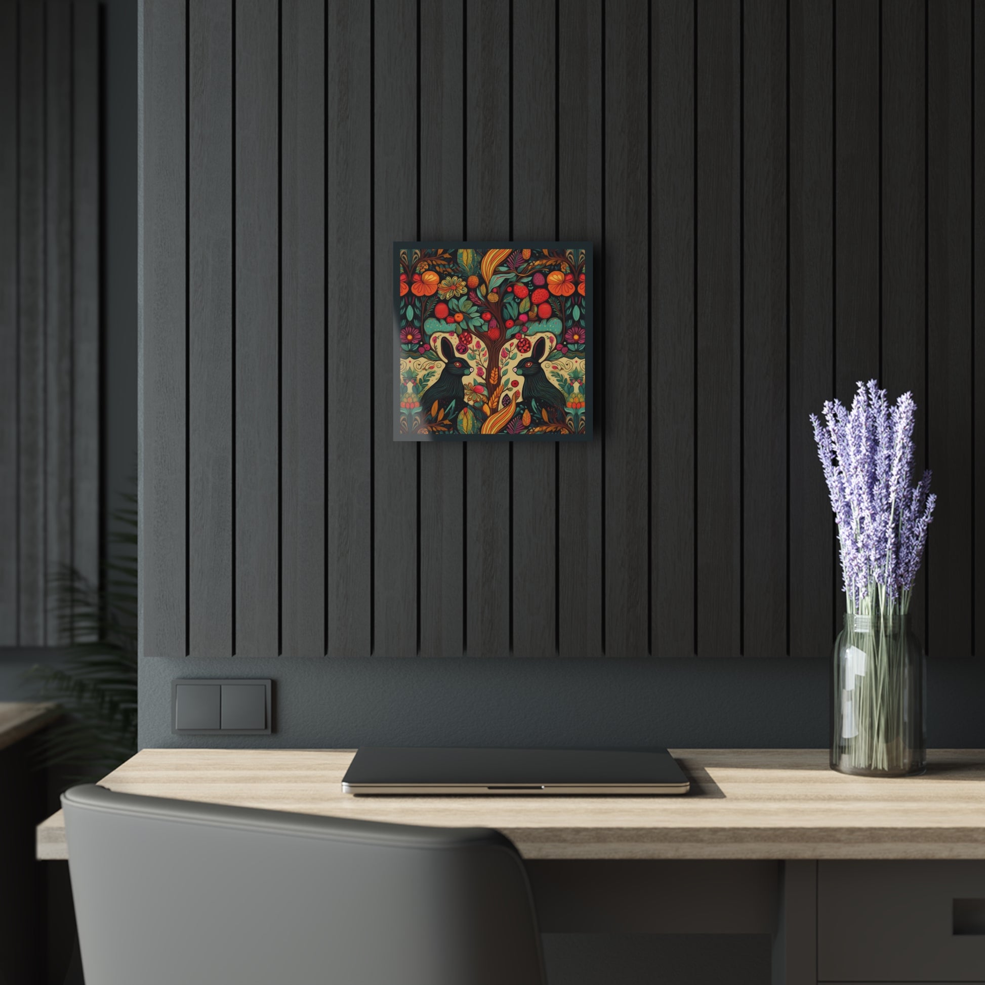 Elevate your space with this surrealistic art deco print of twin black rabbits under an orange tree. Perfect for art enthusiasts and those looking to add a touch of whimsy to their home decor. Ideal for Easter, Halloween, or year-round animal lovers.