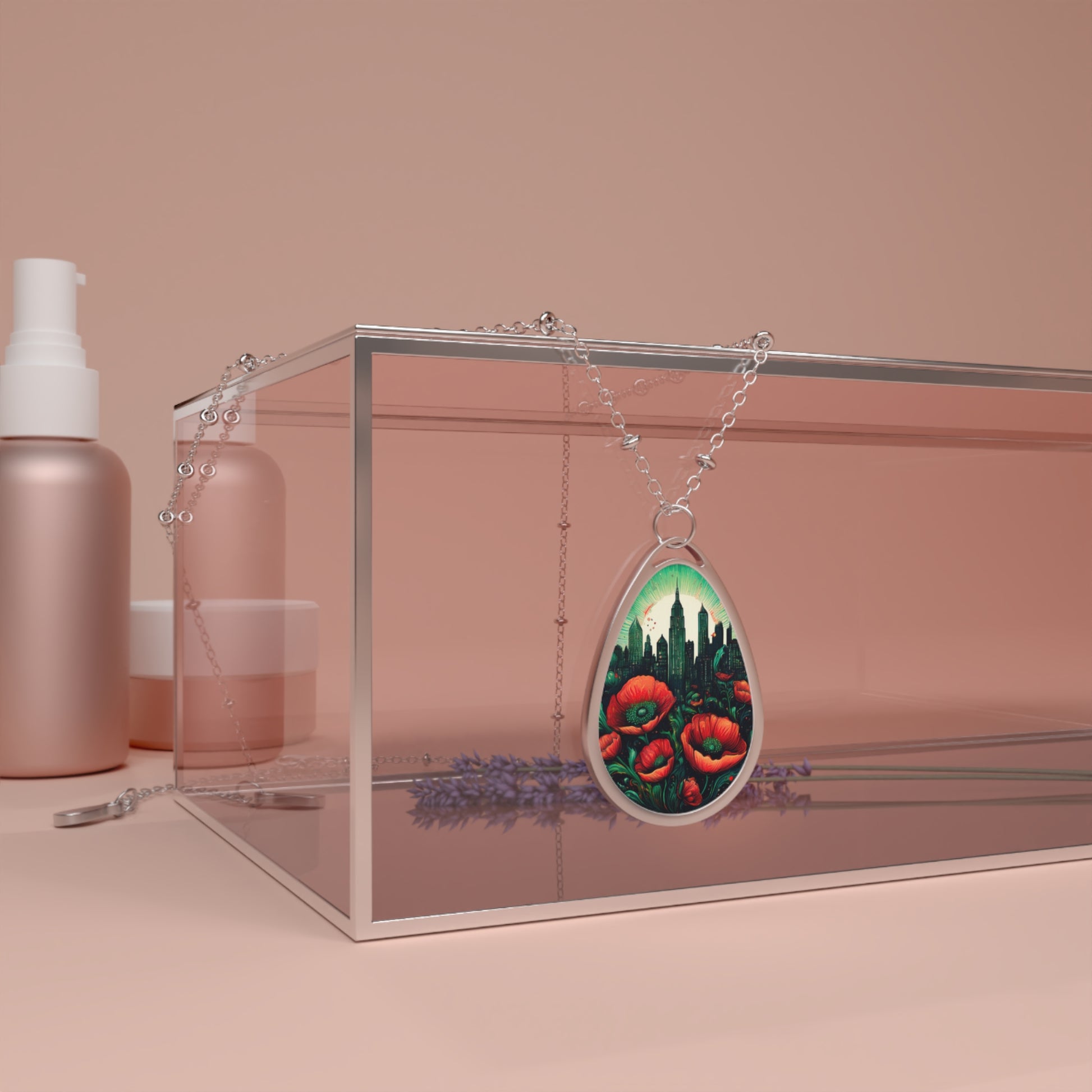 A vibrant and colorful necklace featuring an original illustration of an Emerald City with a field of poppies. This necklace gives off a whimsical and magical vibe, perfect for fans of fantasy and fairy tales. Ideal for those who love unique and eye-catching accessories. Perfect for gifting during birthdays, holidays, or special occasions. Product features - Vibrant colors with crisp designs - Glossy finish for a polished look - Elipse-shaped pendant for customization - Lobster clasp closure for security - Zinc alloy pendant and necklace chain Care instructions - Wipe the dust or any dirt off gently with a clean, dry cloth.
