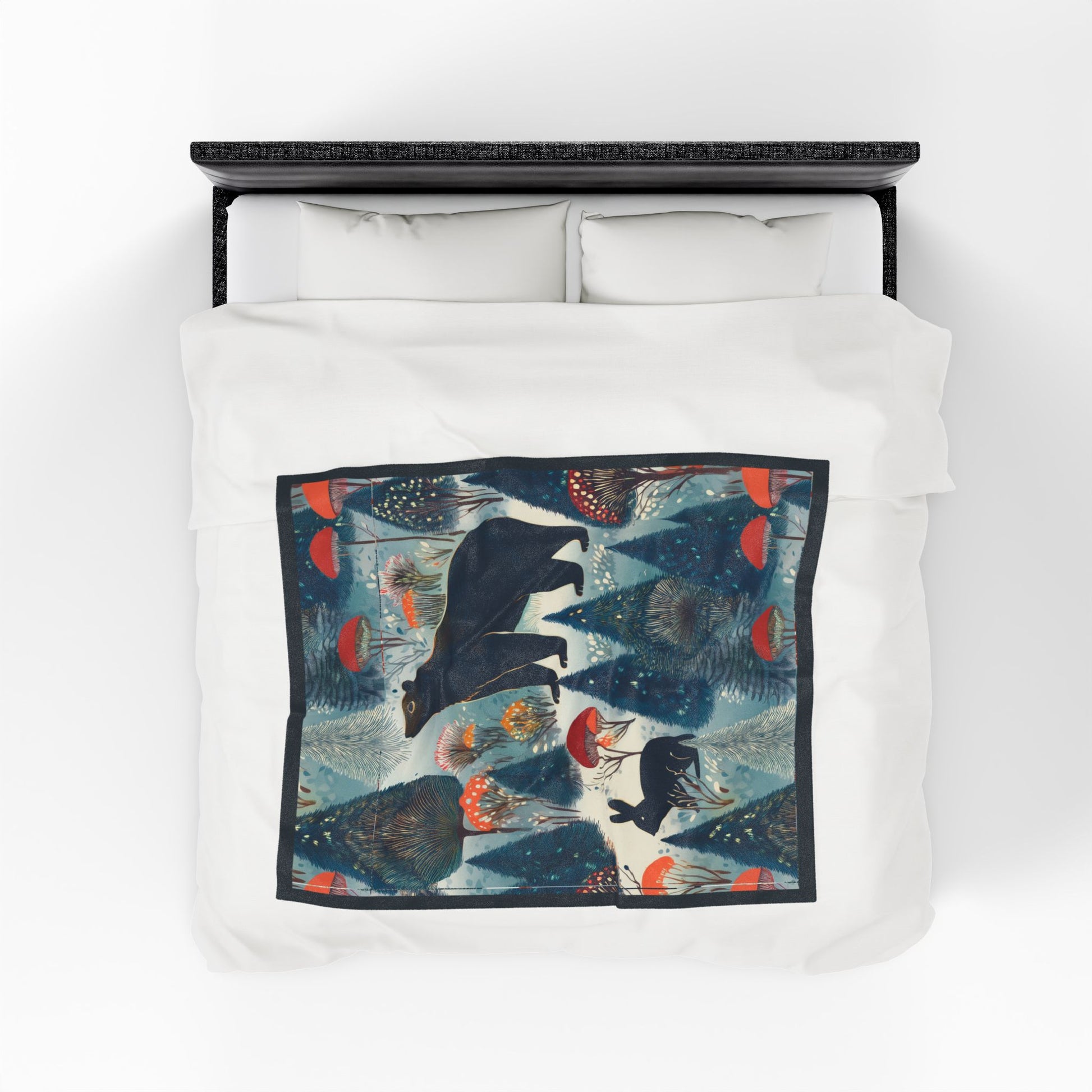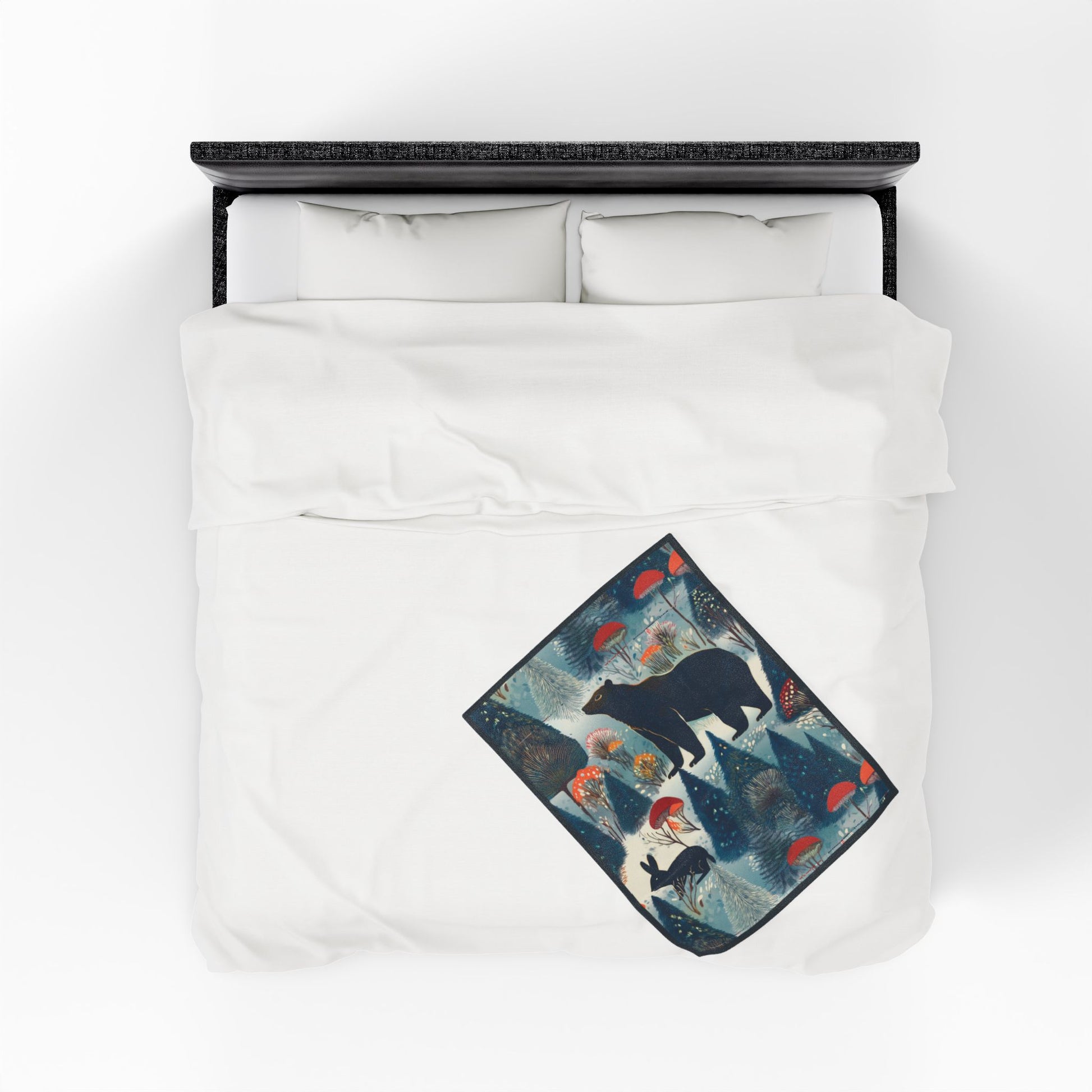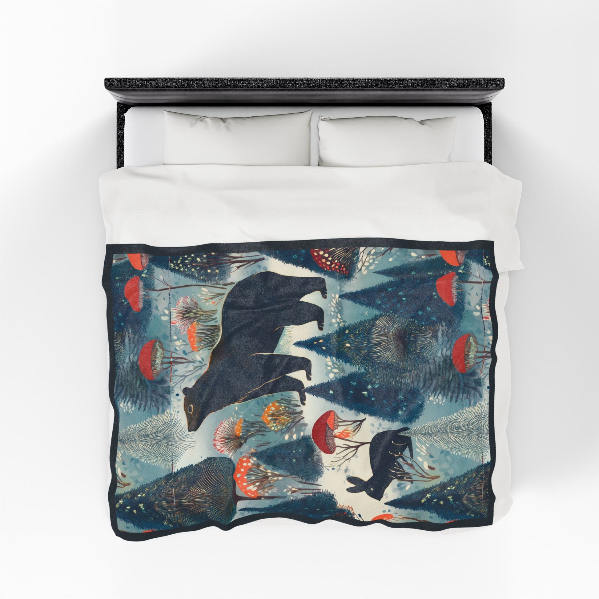 Wrap yourself in a quiet, storybook forest. This velveteen plush blanket feels like a warm hush — soft, slightly heavy, and rich with painterly color. A midnight bear and a shadowed hare wander through stylized pines and mushroom caps rendered in deep blues, muted teals, and pops of coral. Drape it over the sofa during a cool evening, layer it on the foot of a bed, or pull it around your shoulders while reading by lamp light. The artwork adds a cozy, whimsical mood without shouting, bringing a little woodland calm to slow moments and small rituals.