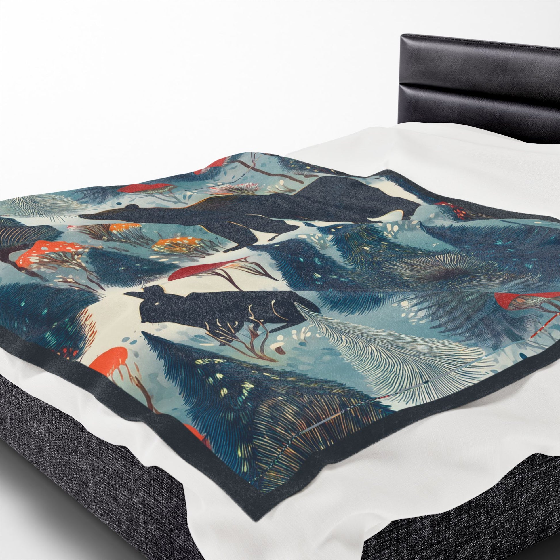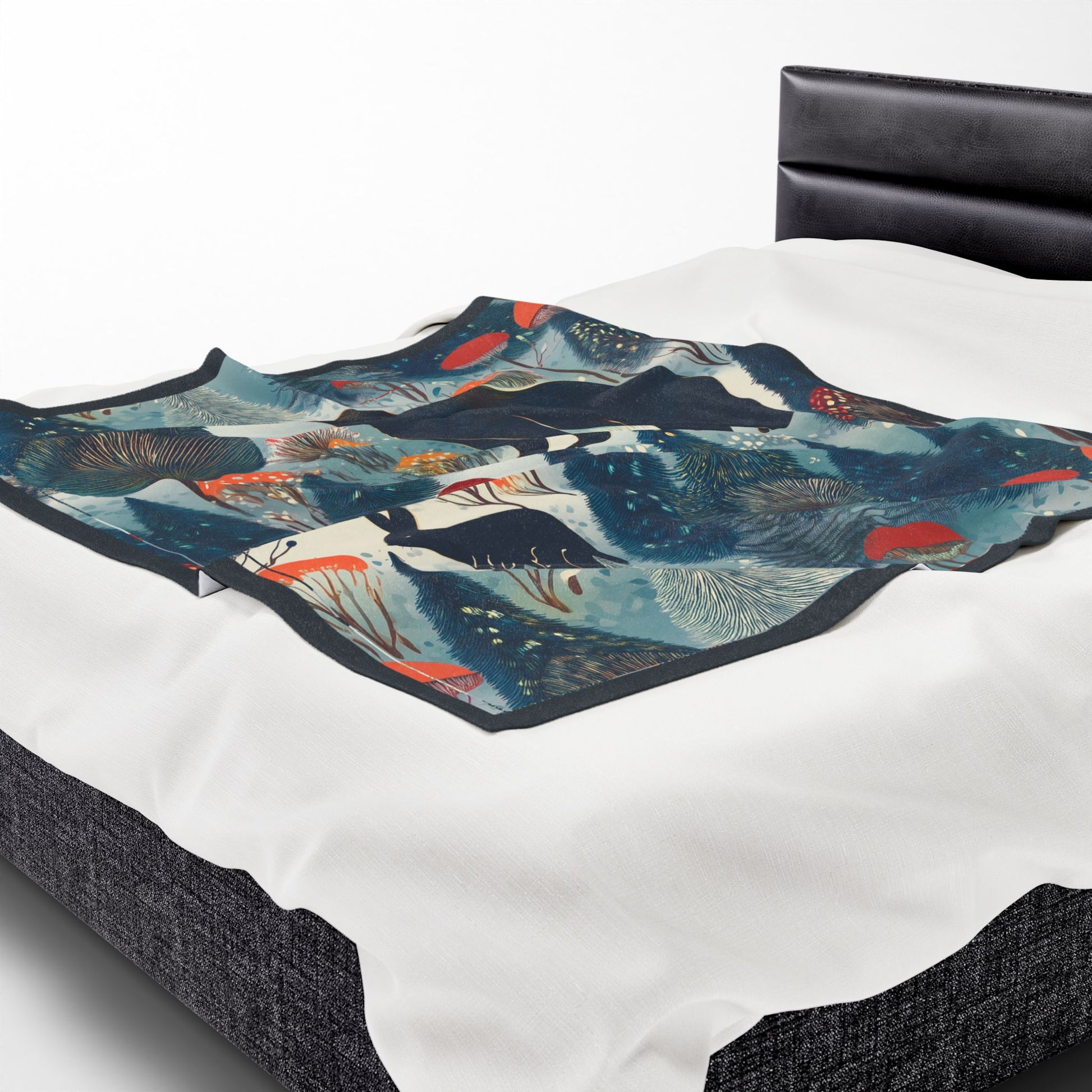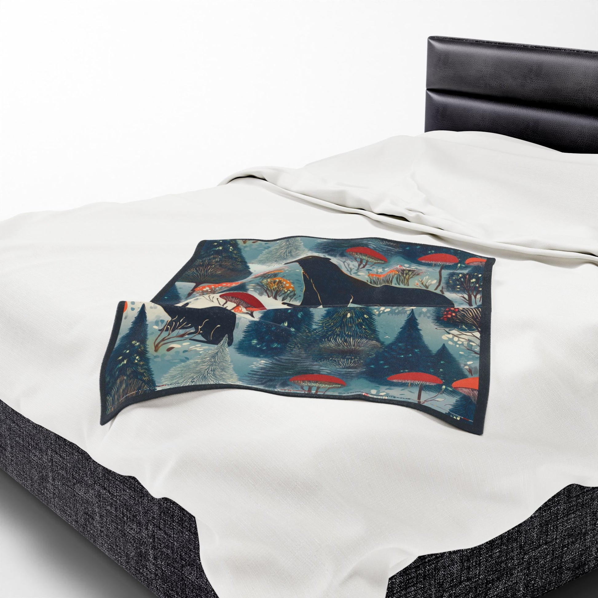Wrap yourself in a quiet, storybook forest. This velveteen plush blanket feels like a warm hush — soft, slightly heavy, and rich with painterly color. A midnight bear and a shadowed hare wander through stylized pines and mushroom caps rendered in deep blues, muted teals, and pops of coral. Drape it over the sofa during a cool evening, layer it on the foot of a bed, or pull it around your shoulders while reading by lamp light. The artwork adds a cozy, whimsical mood without shouting, bringing a little woodland calm to slow moments and small rituals.