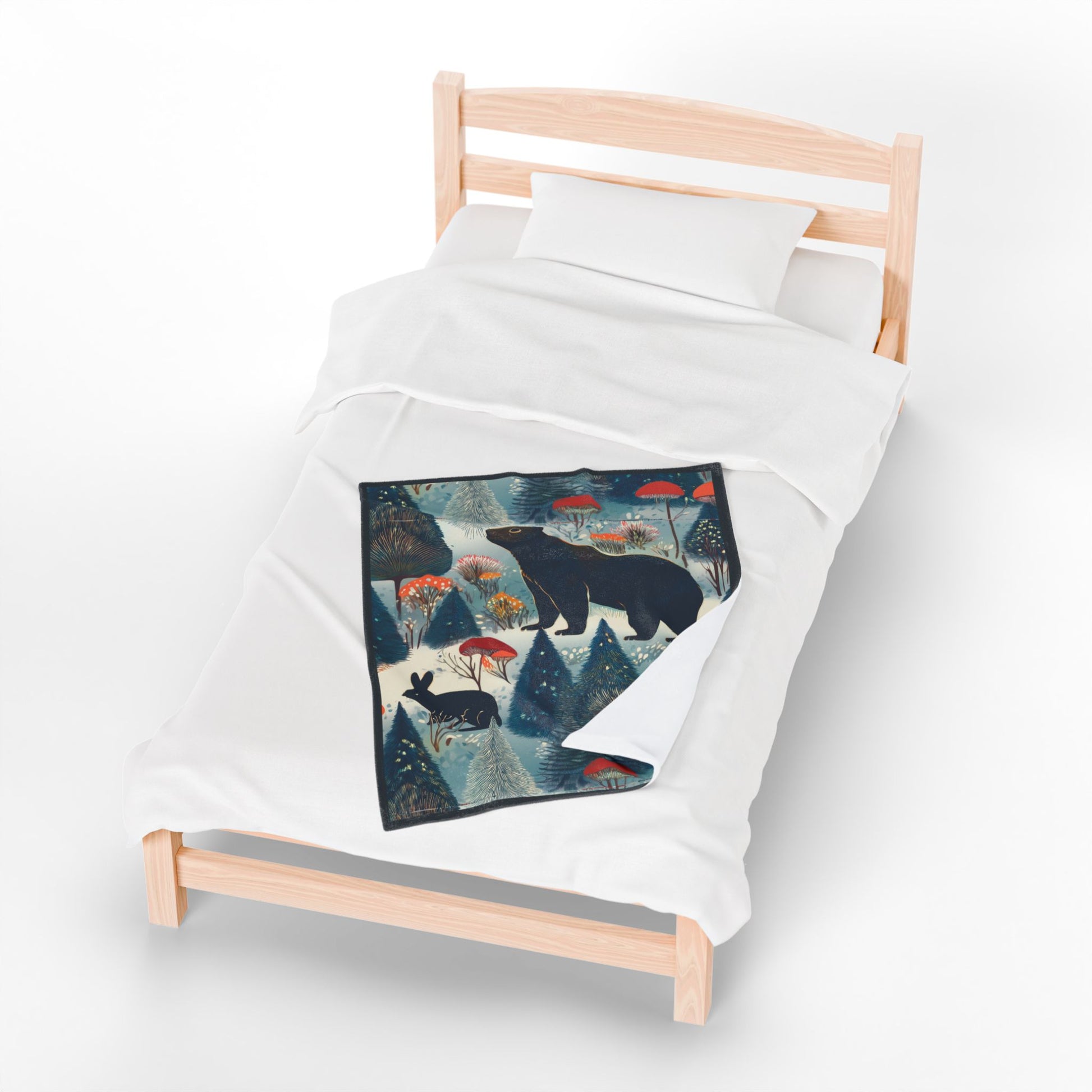 Winter Forest Bear & Rabbit Plush Blanket — Cozy Woodland Throw with Evergreen, Bear, Rabbit & Mushroom Design