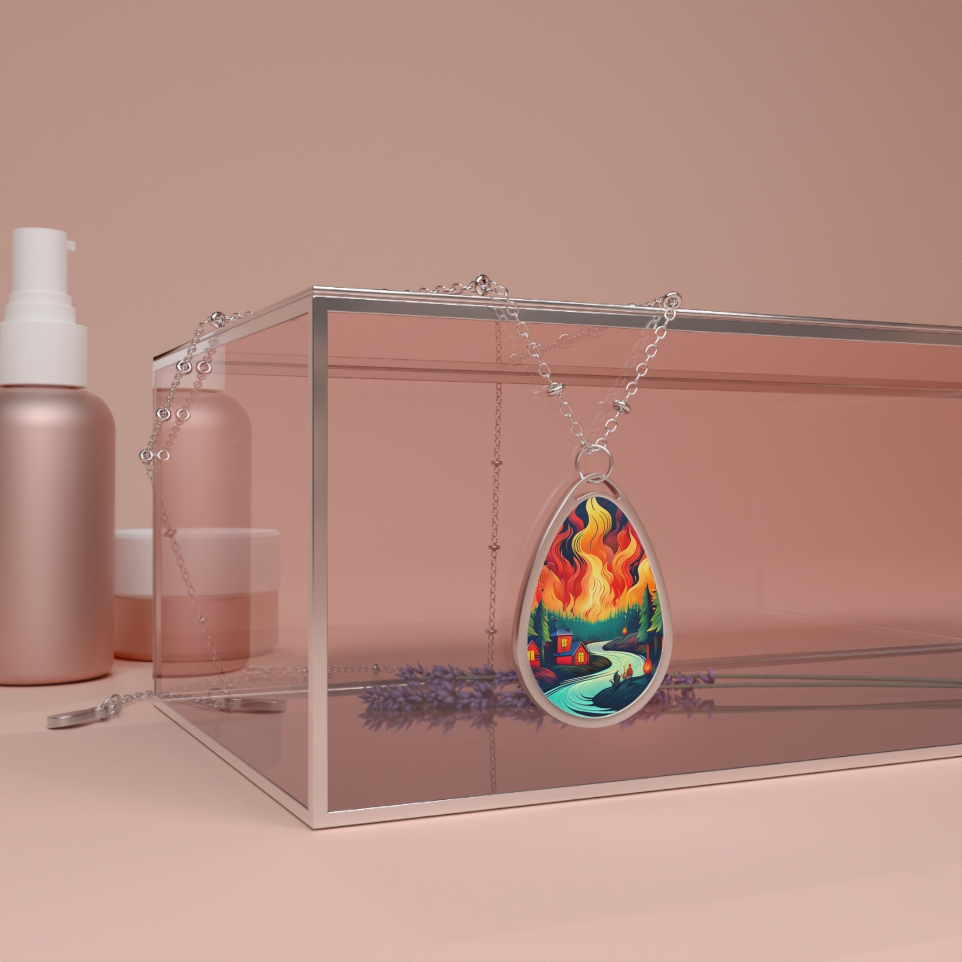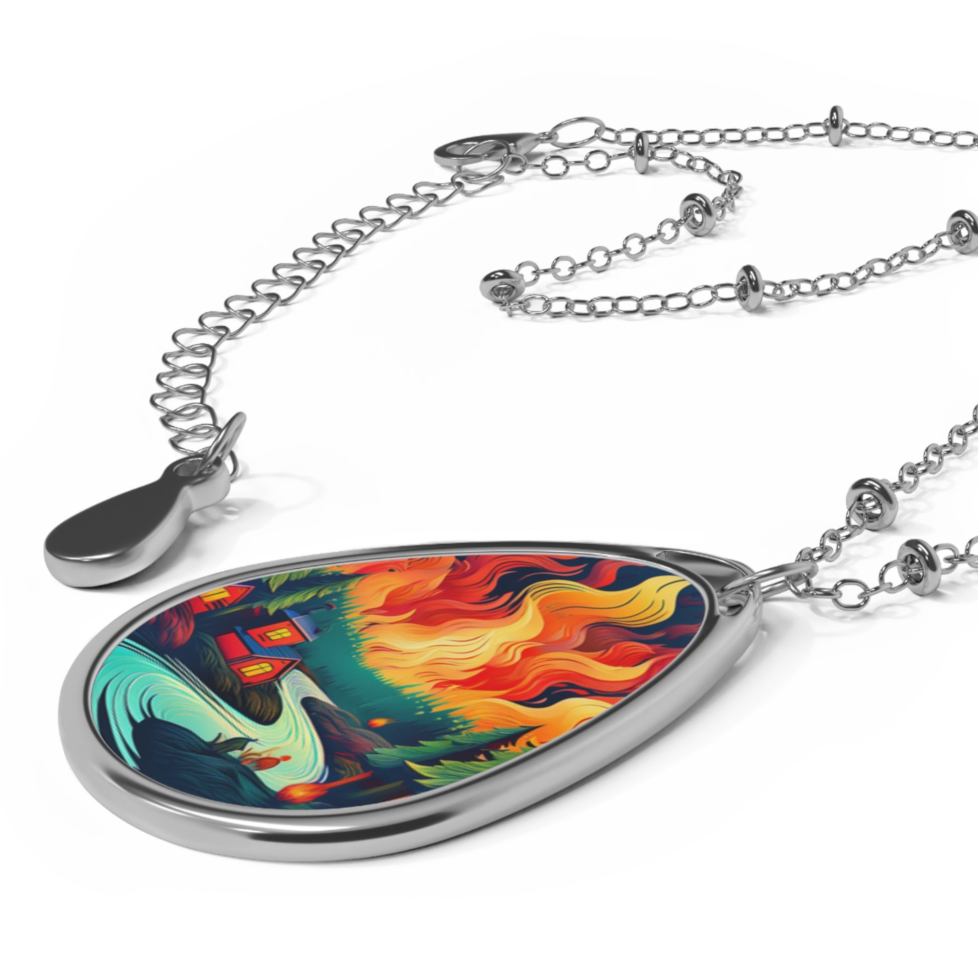 A unique oval necklace featuring vibrant unique art of a quaint village in a forest on fire. Definitely a statement piece. This necklace is perfect for nature lovers and those who appreciate bold, colorful designs. Ideal for wearing during events, class, protests, and everyday. Product features - Vibrant colors with crisp printing - Glossy finish on one side of pendant - Elipse-shaped pendant for customization - Lobster clasp closure for security - Zinc alloy pendant and necklace chain Care instructions - Wipe the dust or any dirt off gently with a clean, dry cloth. EU representative: HONSON VENTURES LIMITED, gpsr@honsonventures.com, 3, Gnaftis House flat 102, Limassol, Mesa Geitonia, 4003, CY Product information: Generic brand, 2 year warranty in EU and Northern Ireland as per Directive 1999/44/EC Care instructions: Wipe the dust or any dirt off gently with a clean, dry cloth.